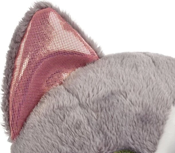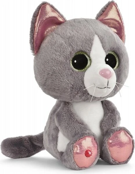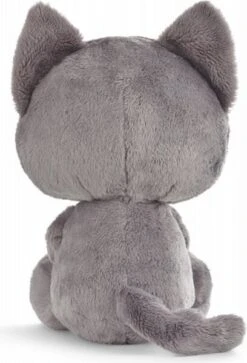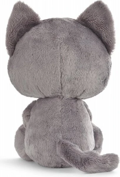 Eine süße graue Katze mit funkelnden Augen und verschiedenen glänzenden Ohren und Pfoten. Für die GREEN-Serie von Nici werden fast ausschließlich Plüsch- und Füllmaterialien aus recycelten Materialien verwendet.