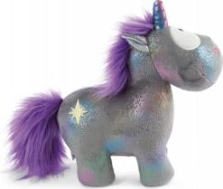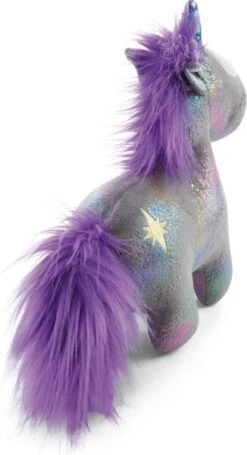 Grau wie die Tiefen der Galaxis kombiniert mit buntem Sternenstaub – das ist der Unicorn Starbringer. Das zauberhafte Fabelwesen fasziniert mit seinem glänzenden Regenbogenhorn und buntem Metallic-Foliendruck auf dem flauschig weichen Plüschkörper. Die tiefviolette Mähne und der Schwanz, die glänzenden kleinen Ohren, der niedliche Gesichtsausdruck und die detaillierte Sternenstickerei auf der Seite sind fabelhaft und verleihen diesem einzigartigen Plüsch-Einhorn eine ganz besondere Aura.