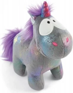 Grau wie die Tiefen der Galaxis kombiniert mit buntem Sternenstaub – das ist der Unicorn Starbringer. Das zauberhafte Fabelwesen fasziniert mit seinem glänzenden Regenbogenhorn und buntem Metallic-Foliendruck auf dem flauschig weichen Plüschkörper. Die tiefviolette Mähne und der Schwanz, die glänzenden kleinen Ohren, der niedliche Gesichtsausdruck und die detaillierte Sternenstickerei auf der Seite sind fabelhaft und verleihen diesem einzigartigen Plüsch-Einhorn eine ganz besondere Aura.