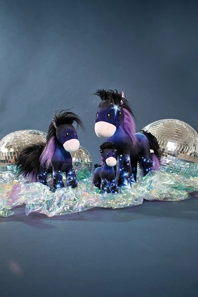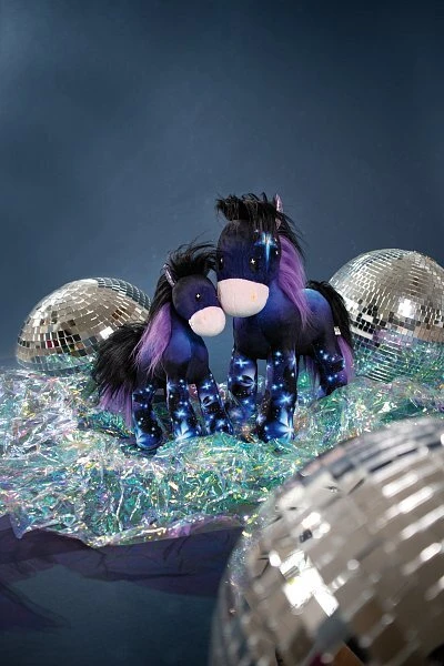 - Glitzernde Stoffohren und -unterseite der Hufe und zweifarbige Mähne und Schweif.