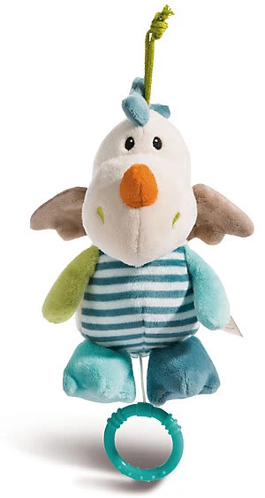 Der zuckersüße Baby-Drache Dragilu spielt Baby eine bezaubernde Melodie vor und hilft damit beim Einschlafen. Die Spieluhr aus der „myFirstNici“ Kollektion präsentiert sich in wunderschönen Farben und begeistert auch mit der orangen Nase, den niedlichen Knopfaugen sowie dem lustigen Drachenkamm. Sobald am Greifring gezogen wird, ertönt Schuberts bekanntes Wiegenlied, das beruhigt und Trost spendet. Besonders praktisch ist die grüne Kordel, mit der Dragilu ganz einfach und schnell am Bettchen, Kinderwagen, an der Wiege oder Babyschale befestigt werden kann.